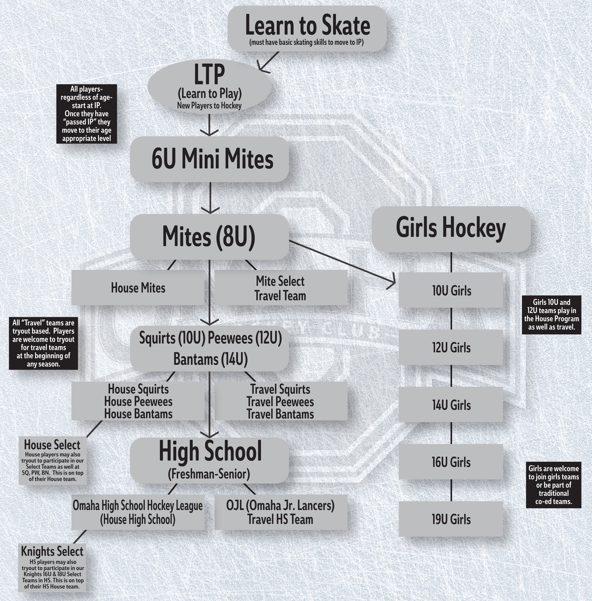 Here is a visual representation in the form of a flowchart to assist you in navigating the various progressions through Omaha Hockey Club. If you have any questions at any stage, please reach out to that programs director (can be found under the "About" section).