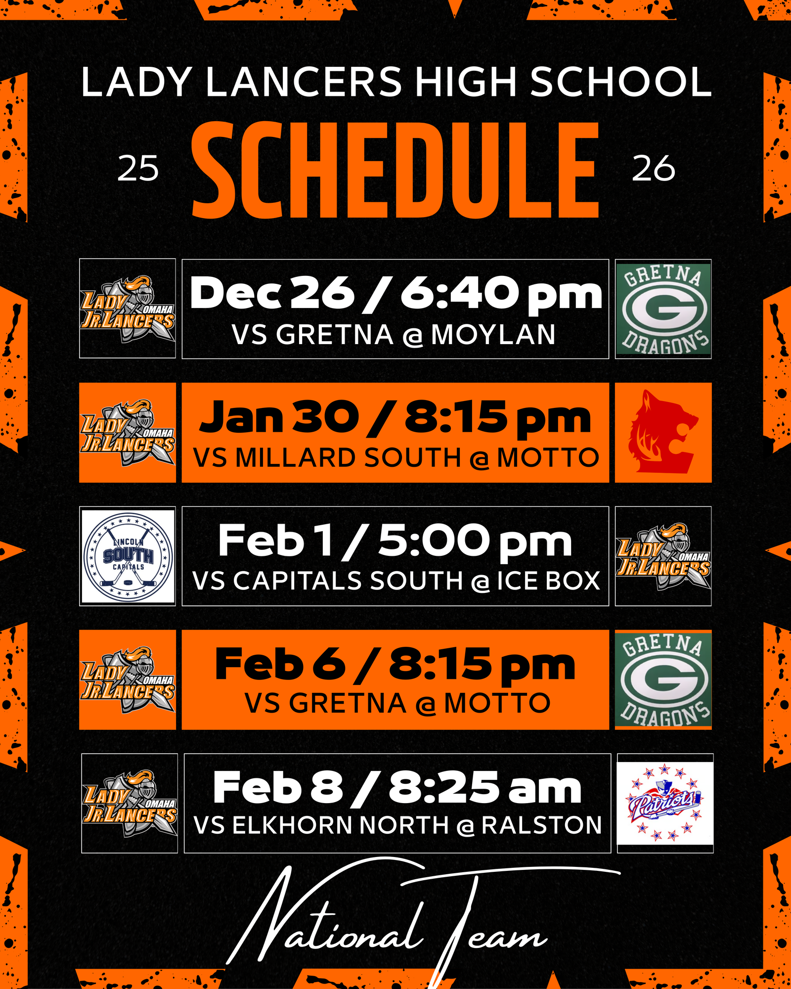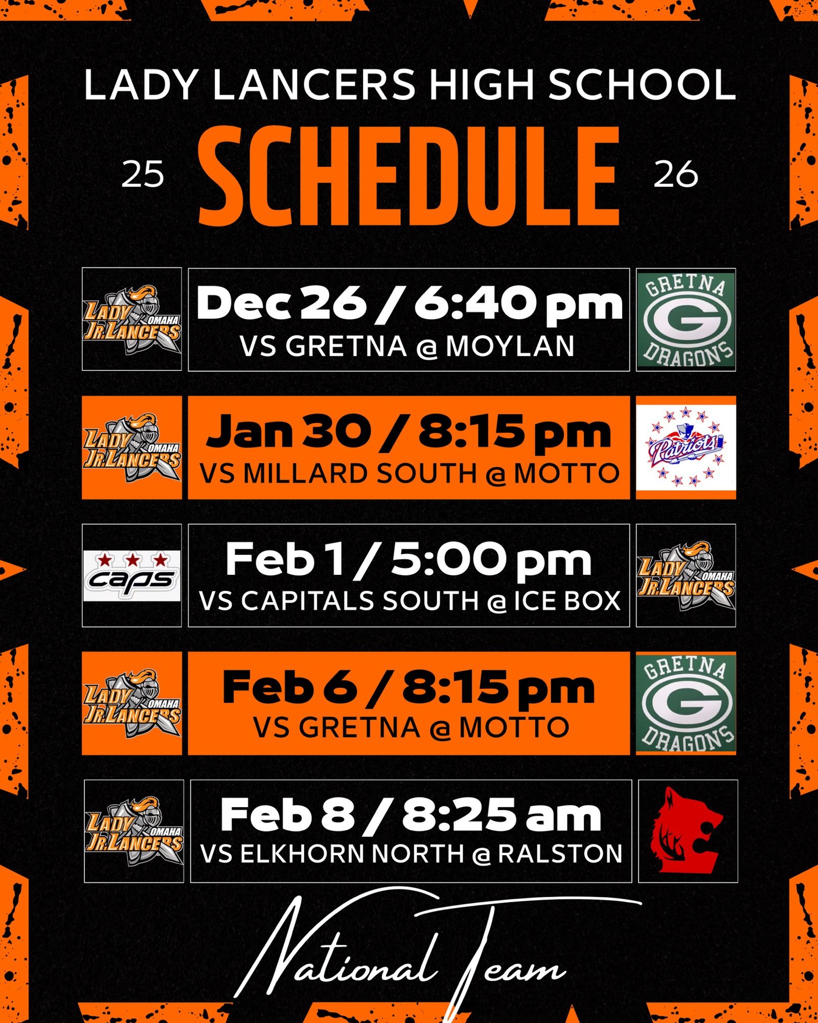 Welcome to the OHC Girls Lady Lancers Travel Program page. Our Lady Lancers Travel Program is specifically tailored to provide young female athletes with the opportunity to travel and compete in various hockey events. Lady Lancers aims to foster skill development, teamwork, and sportsmanship while offering unique experiences and exposure to high-level competition. Our Lady Lancer teams are all formed by a tryout process (14U and older) or Evaluation Skate (10U & 12U) in August of each year. Our 8U team will play in the House Mites division of our organization.